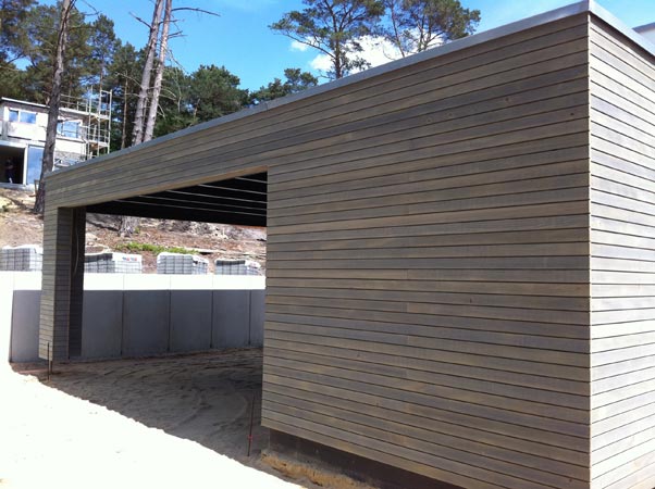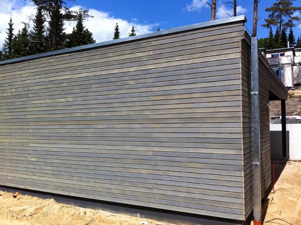 Holzverschalungen gibt es in vielen Farbtönen. Durch die Behandlung mit einem sogenannten Hydrostop ist das Holz lange Jahre geschützt, so dass ein Nachstreichen für viele Jahre entfällt.